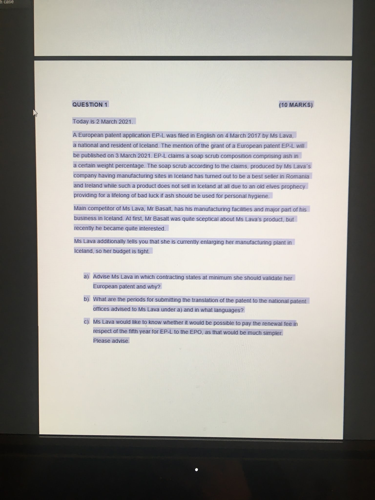 - The first question (10 marks) addressed where to validate in view if the client's and the competitor's business (manufacturing, selling, market situation), translations for validation (full, only claims, none; time limits not all standard), and renewal fees (to EPO or to national offices with renewal falling due shortly after grant)